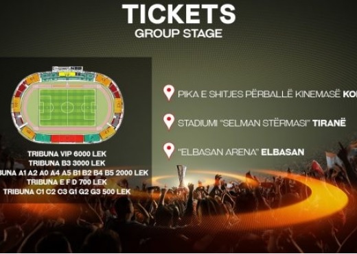 Ticket prices for this European match will be as follows: Tribuna G and C - 500 ALL; Tribune E, D and F - 700 ALL; Tribune A1, A2, A3, A4 - 2000 ALL; Tribune B1, B2, B4, B5 - 2000 ALL; Tribuna B3 - 3000 ALL; VIP Tribune - 6000 ALL.SHOPPING POINTS - Tickets are being sold from Wednesday, October 4, at the point of sale in front of the city cinema in Korça. While in Tirana sellings started on Wednesday, October 11, at the stadium "Selman Stermasi". In the coming days there will also be warning on the point of sale and timetables in the city of Elbasan.